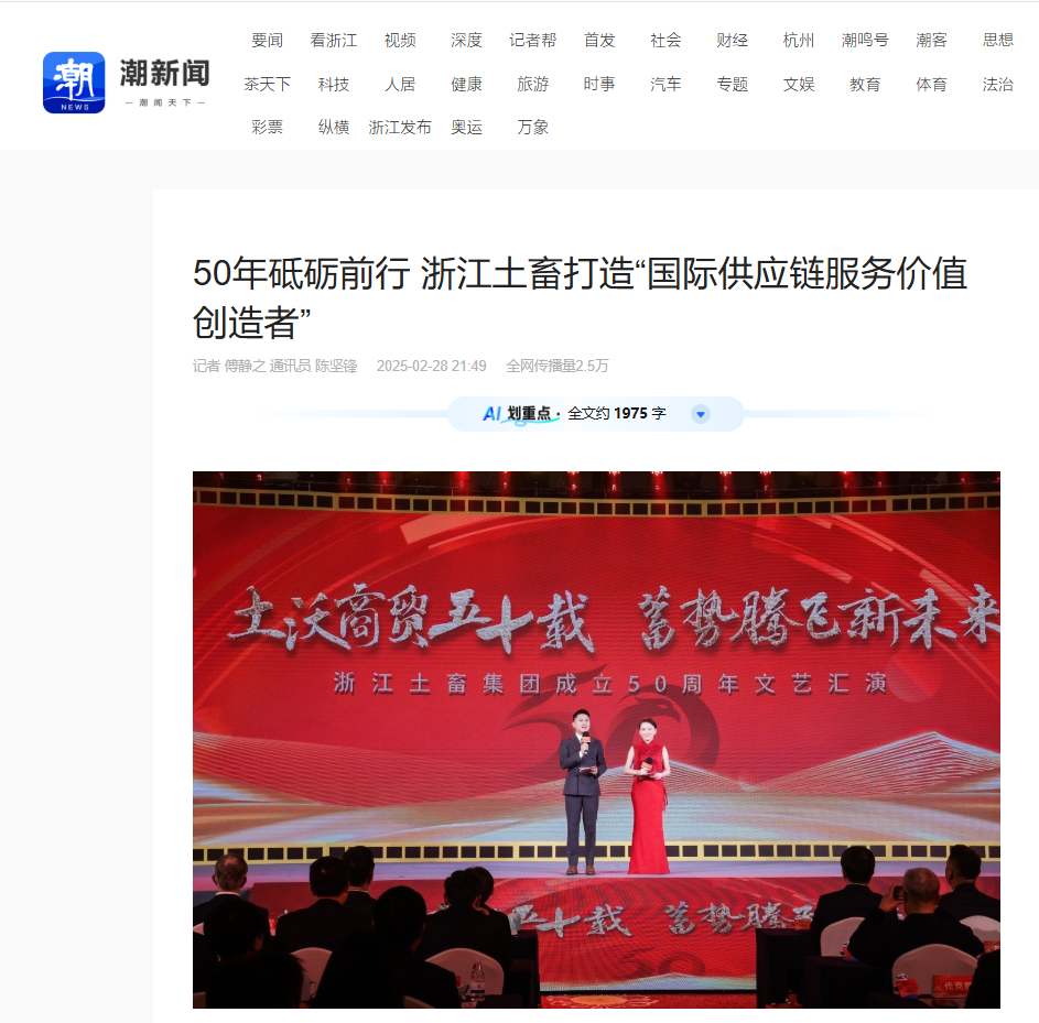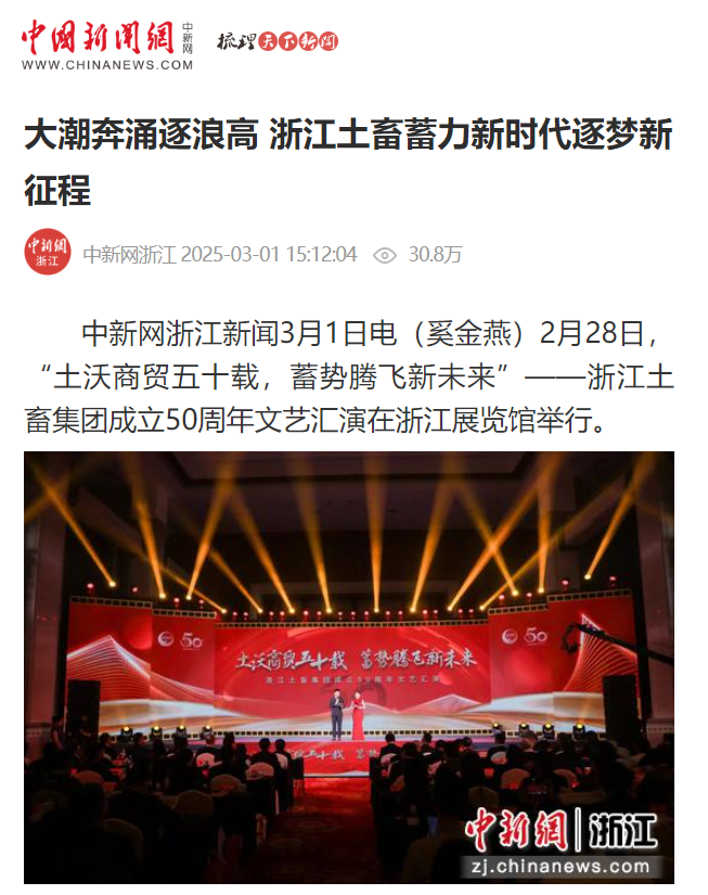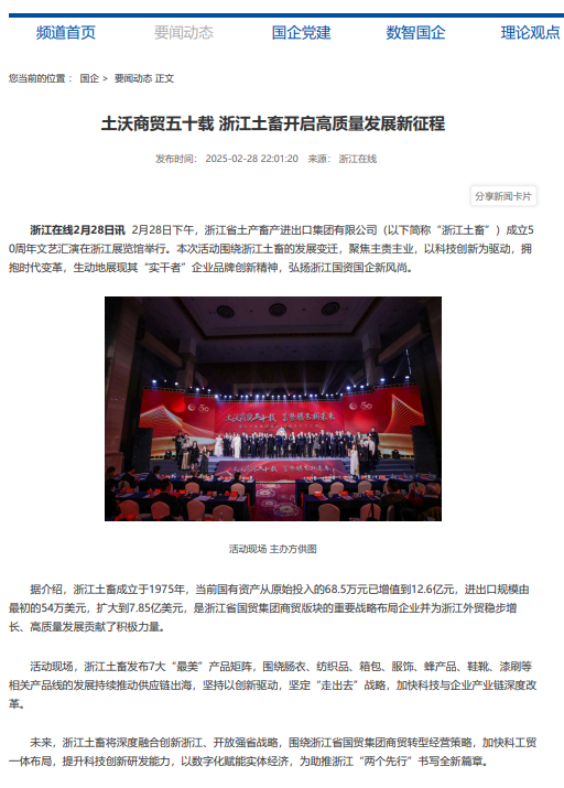 2月28日,浙江省土產(chǎn)畜產(chǎn)進出口集團有限公司(浙江土畜集團)在浙江展覽館舉行公司成立五十周年文藝匯演。本次文藝匯演以“土沃商貿(mào)五十載,蓄勢騰飛新未來”為主題,以“沃土育初心”、“跨越五十載”和“蓄力新時代”為三個篇章,邀請了中國食品土畜進出口商會、中國紡織品進出口商會、浙江省商務(wù)廳、浙江省農(nóng)業(yè)農(nóng)村廳、杭州市拱墅區(qū)人民政府、浙江省國貿(mào)集團、天水街道領(lǐng)導(dǎo)及公司職工代表共計百余人參加活動。浙江日報、中新社浙江分社、潮新聞、人民號、浙江國資、浙江融媒體和今日頭條等媒體報道、轉(zhuǎn)發(fā),全網(wǎng)總閱讀量逾百萬。
