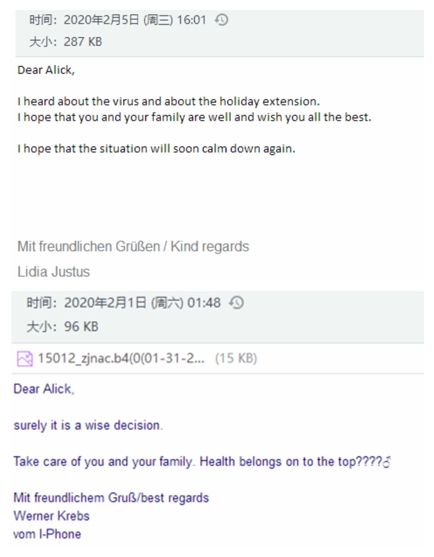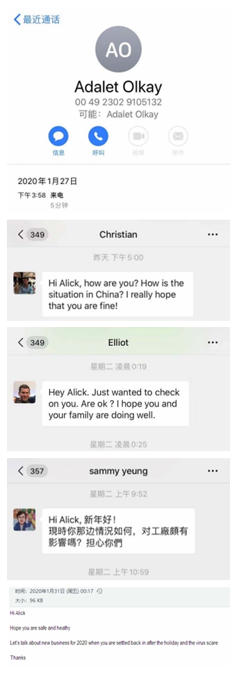 作為業(yè)務(wù)一線的業(yè)務(wù)部門,業(yè)務(wù)六部的客戶分布在美國,德國,意大利,荷蘭等國家,在得知疫情的第一時間,各種問候的郵件就雪花片一般地飛來,因為假期在家,業(yè)務(wù)員沒有第一時間看到郵件,客人就通過微信,甚至直接電話前來詢問是否平安。