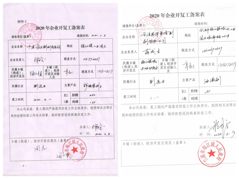 2月8日,省土畜下屬蘭溪墩頭制刷有限公司報備的19項防控措施獲得蘭溪市梅江鎮(zhèn)人民政府批準(zhǔn),成為當(dāng)?shù)厥着絾訌?fù)工流程的企業(yè)。2月9日,省土畜下屬恩澤惠隆制刷有限公司的復(fù)工申請獲得蘭溪市梅江鎮(zhèn)人民政府批準(zhǔn)。